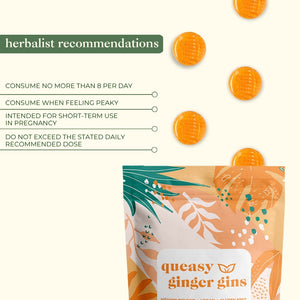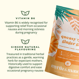 Popular Newcomer! Overcome Morning sickness symptoms with the help of our ‘Queasy Days Ginger Gins’ with vitamin B6. Perfect for on the move or when symptoms of nausea creep up, our ginger sweets soothe the stomach and ease first trimester sickness whilst giving you a well needed energy boost.