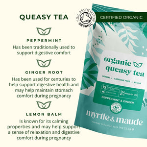 QUEASY DAYS ORGANIC HERBAL TEA - 15 x Tea Bags. Ingredients: Peppermint (35%), Ginger root (25%), Lemon balm (15%) Chamomile (15%), Rose petal (5%), Orange peel (5%)