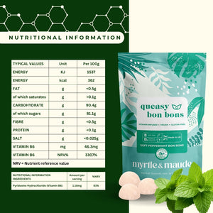 QUEASY DAYS BON BONS WITH VITAMIN B6 - 130g Per Pack. Ingredients: White sugar, Glucose Syrup, Peppermint Oil, Pyridoxine Hydrochloride (Vitamin B6)