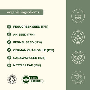Ingredients: Fenugreek 17%, Aniseed 17%, Fennel Seed 17%, German Chamomile 17%, Caraway Seed 16%, Nettle Leaf 16%