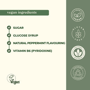 Ingredients: White sugar, Glucose Syrup, Peppermint Oil, Pyridoxine Hydrochloride (Vitamin B6)